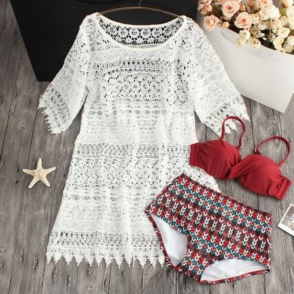 繊細なカギ編みワンピから覗く赤い水着がキュート♡