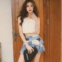 デニムプリントのパッチワーク柄が大人スタイル♡♥おしゃれハイネックビキニの3点セット☺☆♪ CGRI000061