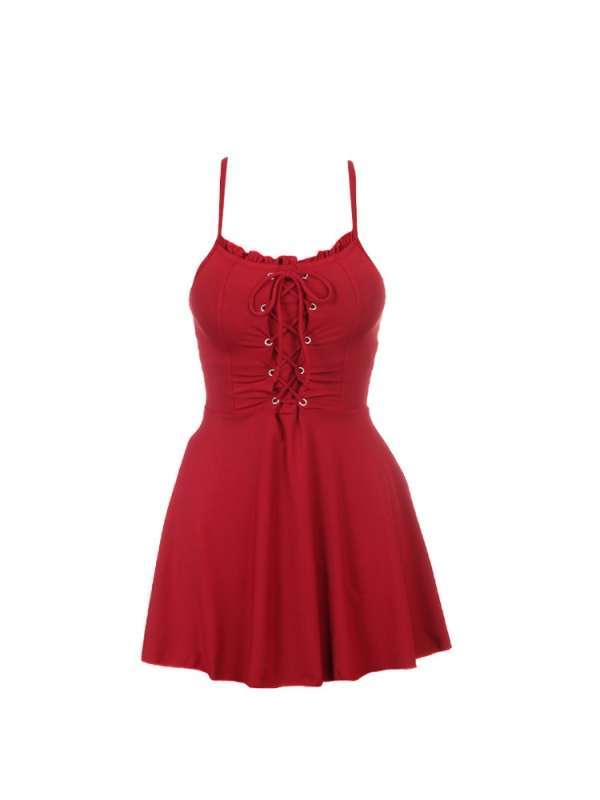 ワンピース 水着 スカート 編み上げ リボン フリル ストラップ 赤 レッド ママ水着 CGAM000280