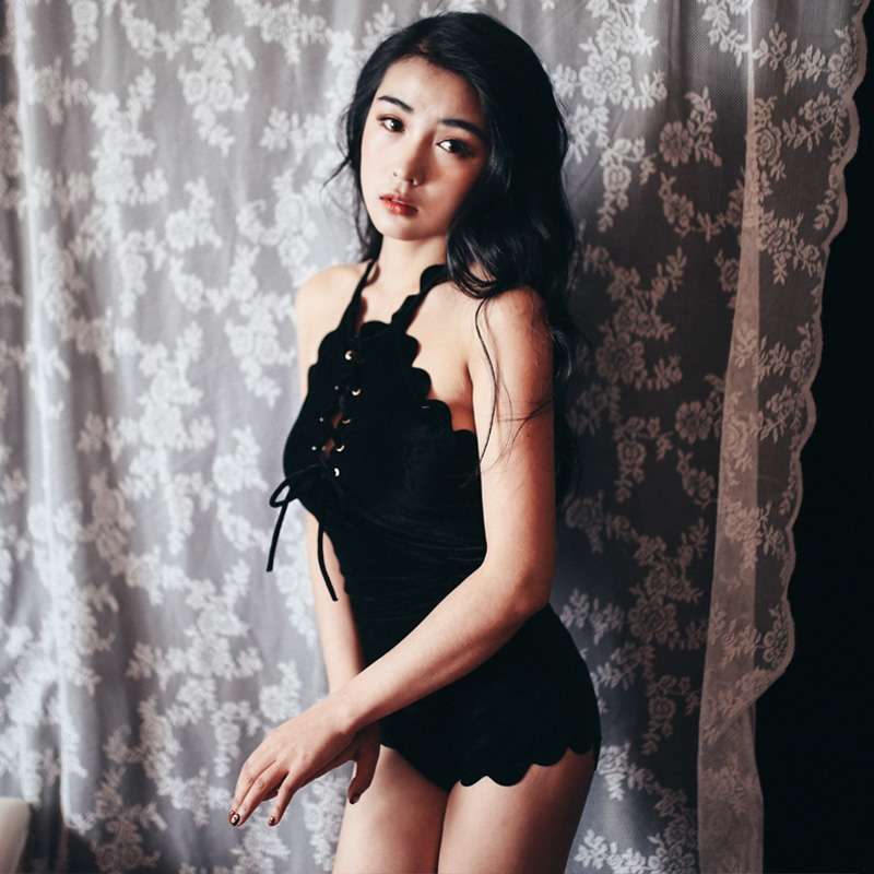 ワンピース 水着 ホルターネック 編み上げ レース ベロア 黒 ママ水着 CGAM000292