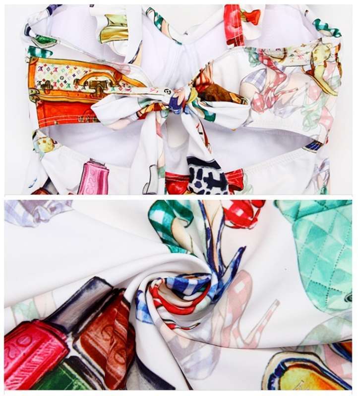ワンピース 水着 ビスチェ イラスト カラフル フリル バックリボン 個性的 ホワイト ブラック CGAH000305