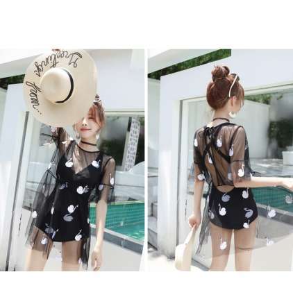 シースルー 水着 ワンピース バッククロス セクシー ブラック セット 個性的 白鳥柄 CGAH000254
