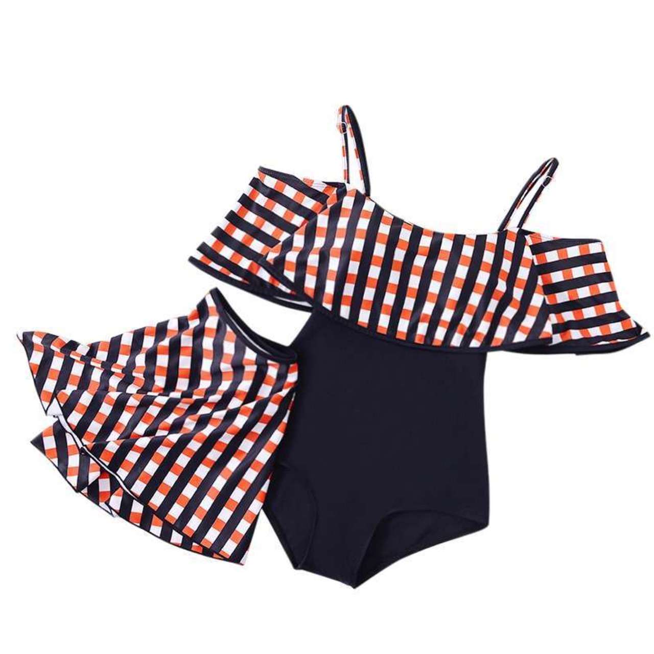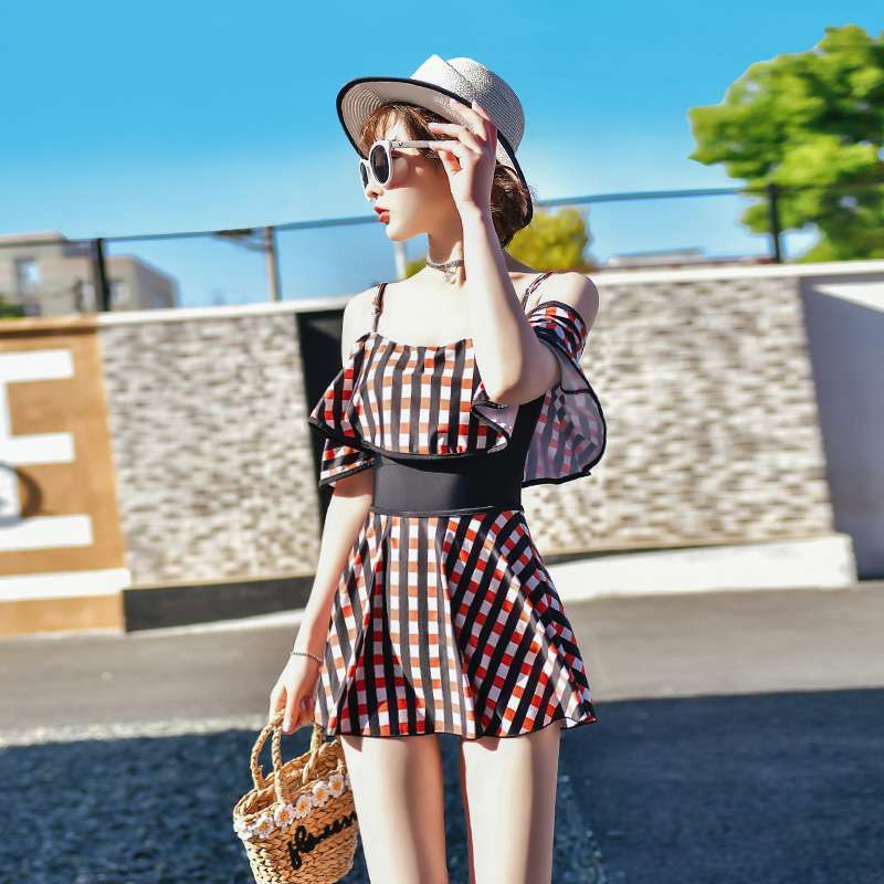 オフショルダーワンピース水着/ チェック柄 オレンジ スカート 2way フリル CGAM000253