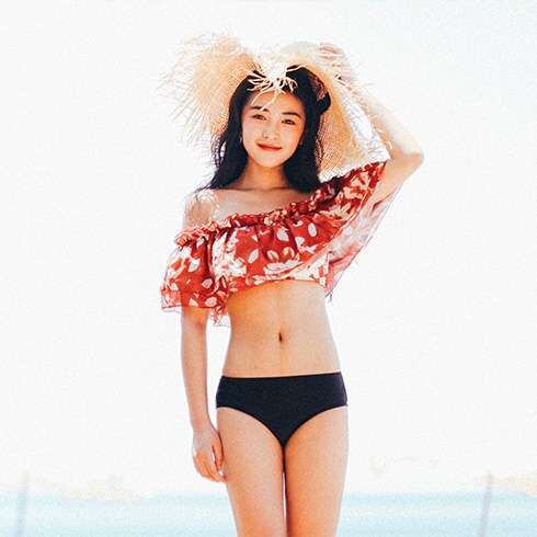 トレンドのオフショルにフリルをあしらったフェミニンな水着。