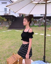新作水着 オフショルダー 水玉 ドット レトロ ショートパンツ 可愛い 大人可愛い 体形カバー CGAH000518