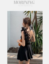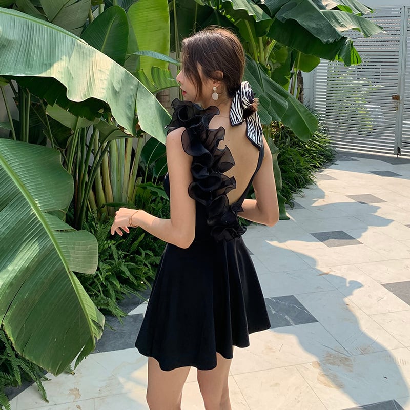 左肩のボリュームのあるフリルデザインが個性的なワンピース水着。