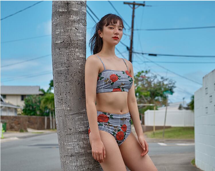 千鳥格子柄バラのイラストがレトロかわいい水着。