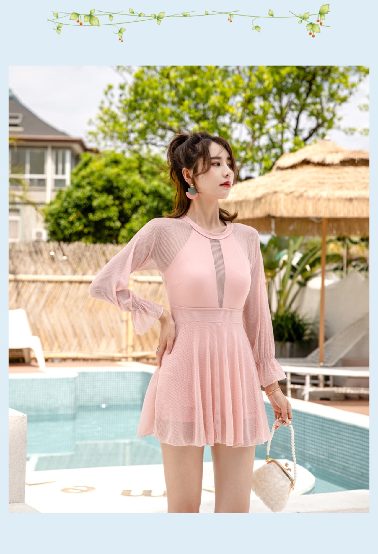ところどこと透け感のあるデザインが上品でかわいいワンピース水着。